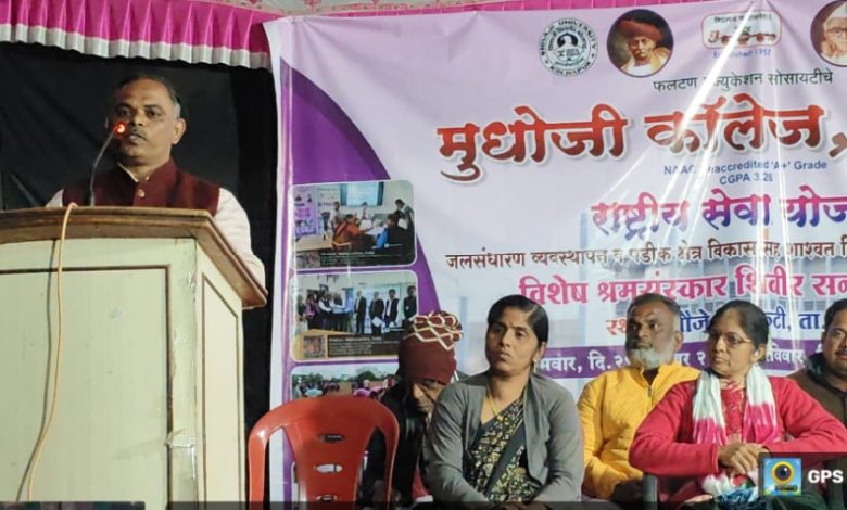 (फलटण/ प्रतिनिधी )शिवाजी विद्यापीठ कोल्हापूर व फलटण एज्युकेशन सोसायटीचे मुधोजी महाविद्यालय , फलटण आयोजित राष्ट्रीय सेवा योजना विशेष श्रमसंस्कार शिबिर मौजे भिलकटी येथे मंगळवार , दिनांक 30 डिसेंबर,2025 रोजीआयोजित कार्यक्रमात प्रा. लक्ष्मीकांत वेळेकर ” राष्ट्रनिर्मितीतील युवकांचे योगदान ” विषयावर बोलत होते . ते पुढे म्हणाले की,